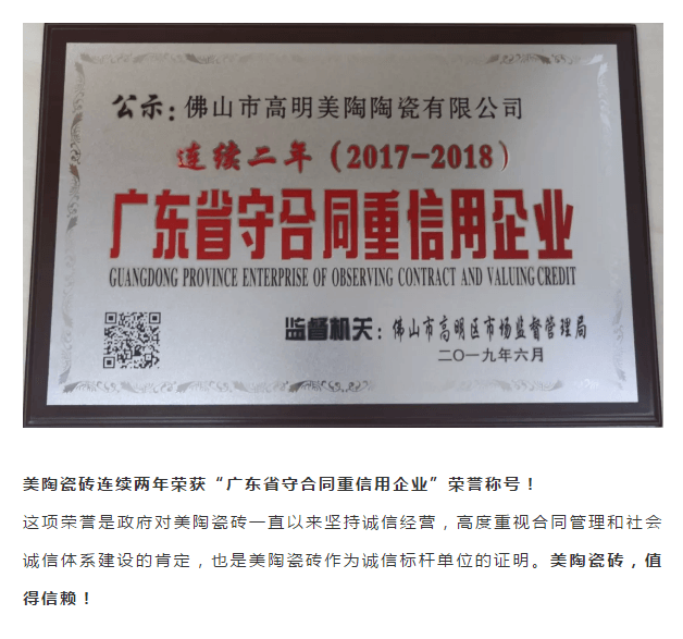 以誠信 贏贊譽丨美陶瓷磚榮獲“廣東省守合同重信用企業”